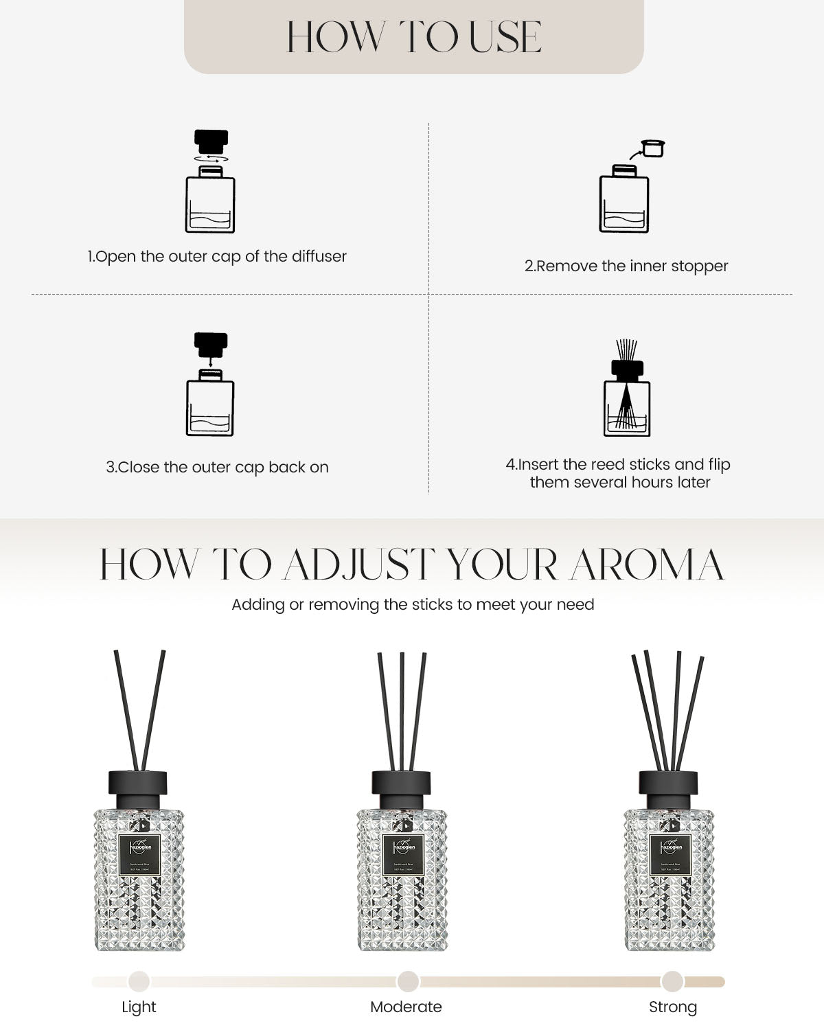 洗練されたモダンなデザインが、どんな空間にもラグジュアリーな雰囲気を添えます。開けて置くだけですぐに使えます。お手入れやメンテナンスは不要です。リードスティックをひっくり返したり、付け外ししたりすることで、香りの強さを簡単に調節できます。